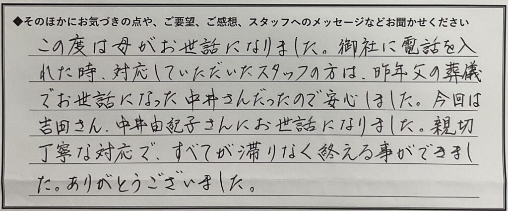 この度は母がお世話になりました。御社に電話を入れた時、対応していただいたスタッフの方は、昨年父の葬儀でお世話になった中井さんだったので安心しました。