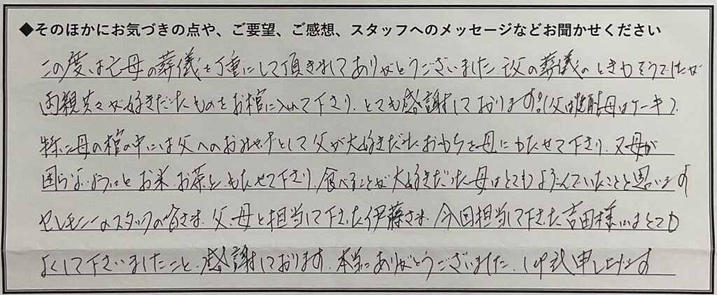 セレモニーのスタッフの皆さま、父・母と担当してくださった伊藤さま、今回担当して下さった吉田様にはとてもよくして下さいましたこと感謝しております。