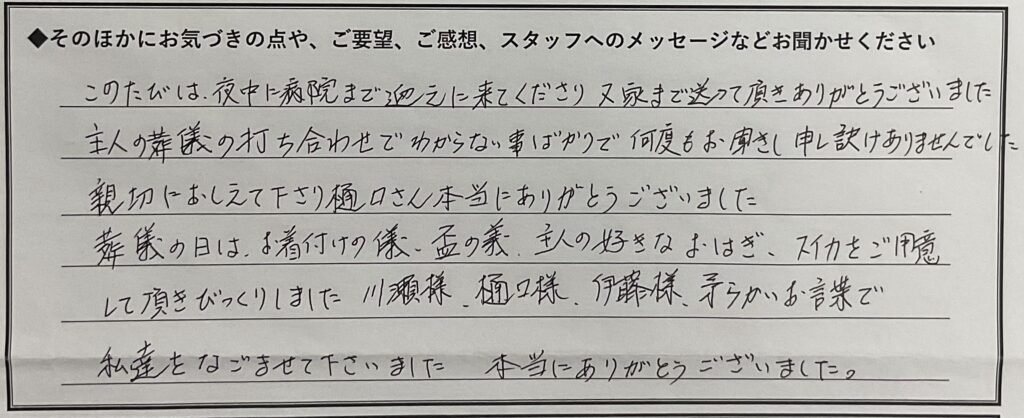 主人の葬儀の打ち合わせでわからない事ばかりで何度もお聞きしもうし訳ありませんでした。