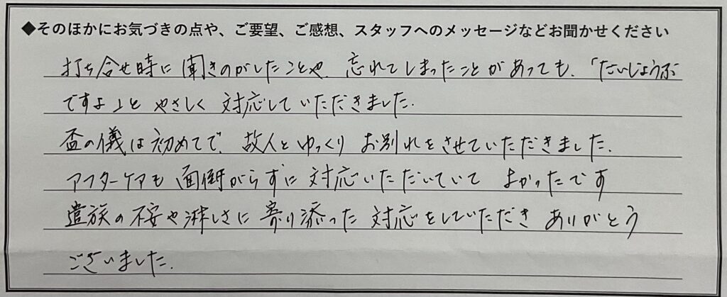 遺族の不安や淋しさに寄り添った対応をしていただきありがとうございました