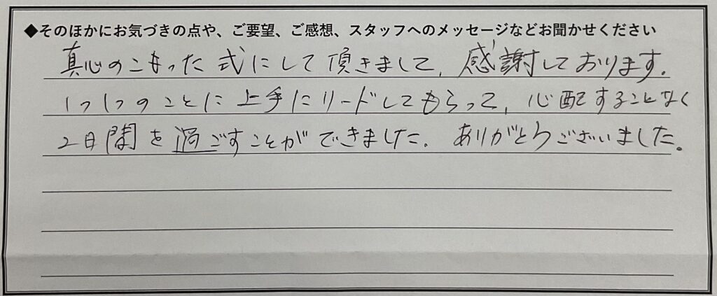 真心を込めてお手伝いさせていただいたことを、そのように感じていただけてとてもうれしく思い、スタッフ一同何よりの励みとなります