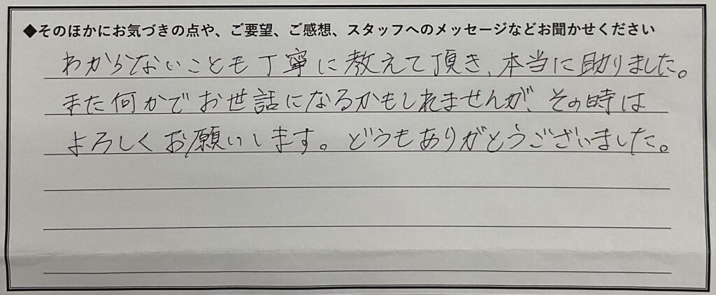 わからないことも丁寧に教えて頂き、本当に助かりました。