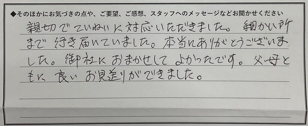 大切な旅立ちをお手伝いさせていただけたこと、心より光栄に存じます。「細かい所まで行き届いていた」とのお褒めの言葉は、私共にとって何よりの励みとなります。