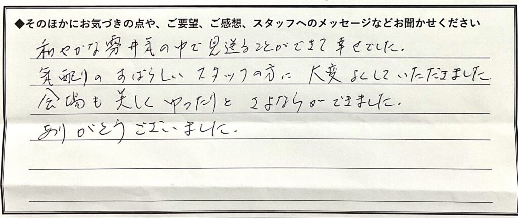 和やかな雰囲気の中でお見送りいただけたとのこと、私どもも大変うれしく思っております。