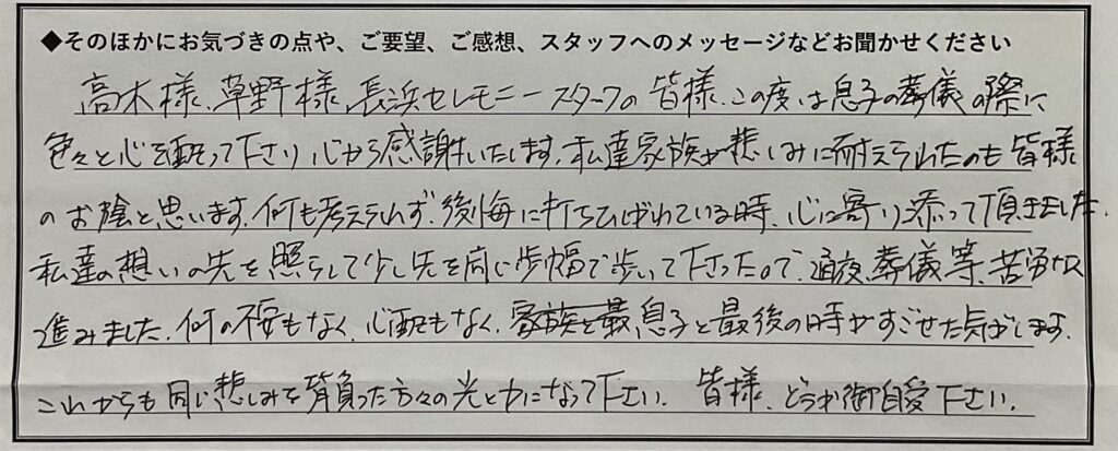 ご家族皆様のお気持ちを大切にしながら、お見送りのお手伝いができましたこと